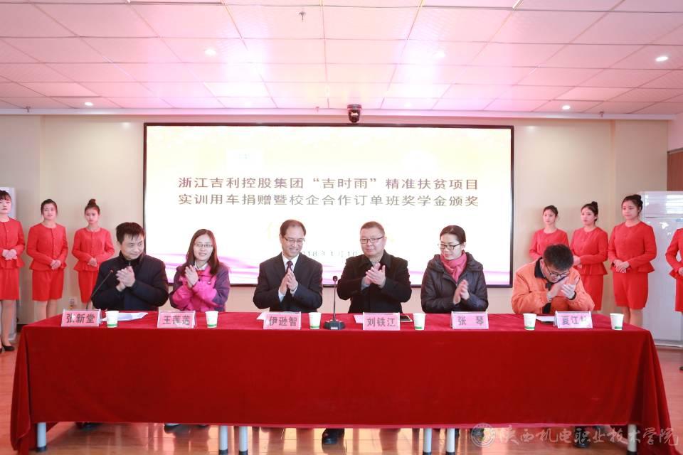 新年伊始,陕西机电职业技术学院2018年1月10日在汽车机电大楼4楼会议室隆重举行“浙江吉利控股集团‘吉时雨’精准扶贫项目实训用车捐赠暨2017年度校企合作订单班奖学金颁发仪式”。