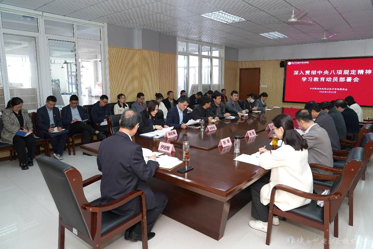 3月25日上午,陕西机电职业技术学院党委在蟠龙校区图书馆二楼会议室召开深入贯彻中央八项规定精神学习教育动员部署会。学校党委委员、校领导,各党支部书记,中层干部,部门负责人参加会议,党委书记伊逊智作动员讲话,会议由党委副书记张琴主持。