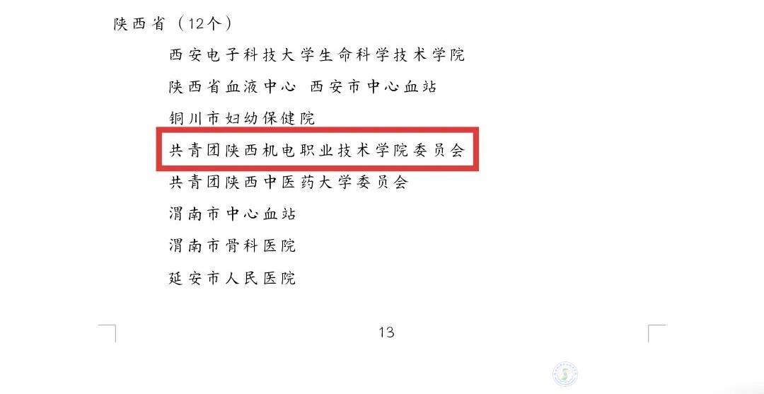 近日,国家卫生健康委员会、中国红十字会总会、中央军委后勤保障部卫生局联合印发《关于表彰2022—2023年度全国无偿献血表彰奖励获奖者的决定》,共青团陕西机电职业技术学院委员会凭借在无偿献血工作中的扎实举措与突出成效,成功斩获国家“无偿献血促进奖”单位奖,这份荣誉既是对学校工作的高度肯定,更是对全校师生公益情怀的有力彰显。
